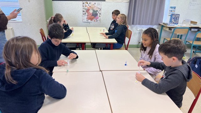 Ce lundi matin 24 novembre 2025 nous accueillons Anna et Vanessa des Petits Débrouillards pour la 2ème séance axée sur l’environnement et la pollution de l’eau. Tout le monde manipule des produits avec des pipettes.