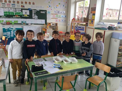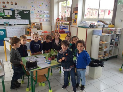 Cette année, notre "petit jardin" se trouve devant notre classe (côté parking du personnel de l'école). La semaine dernière, nous avions semé des graines de fleurs (Coquelicot, Pavot de Californie, Bleuet, Souci des jardins "Maya") et planté un cassissier, un plant de Souci, de Guimauve et un plant de Camomille.