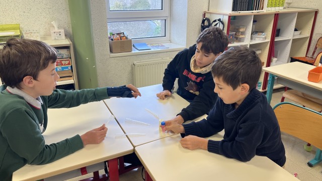 Ce lundi matin 24 novembre 2025 nous accueillons Anna et Vanessa des Petits Débrouillards pour la 2ème séance axée sur l’environnement et la pollution de l’eau. Tout le monde manipule des produits avec des pipettes.