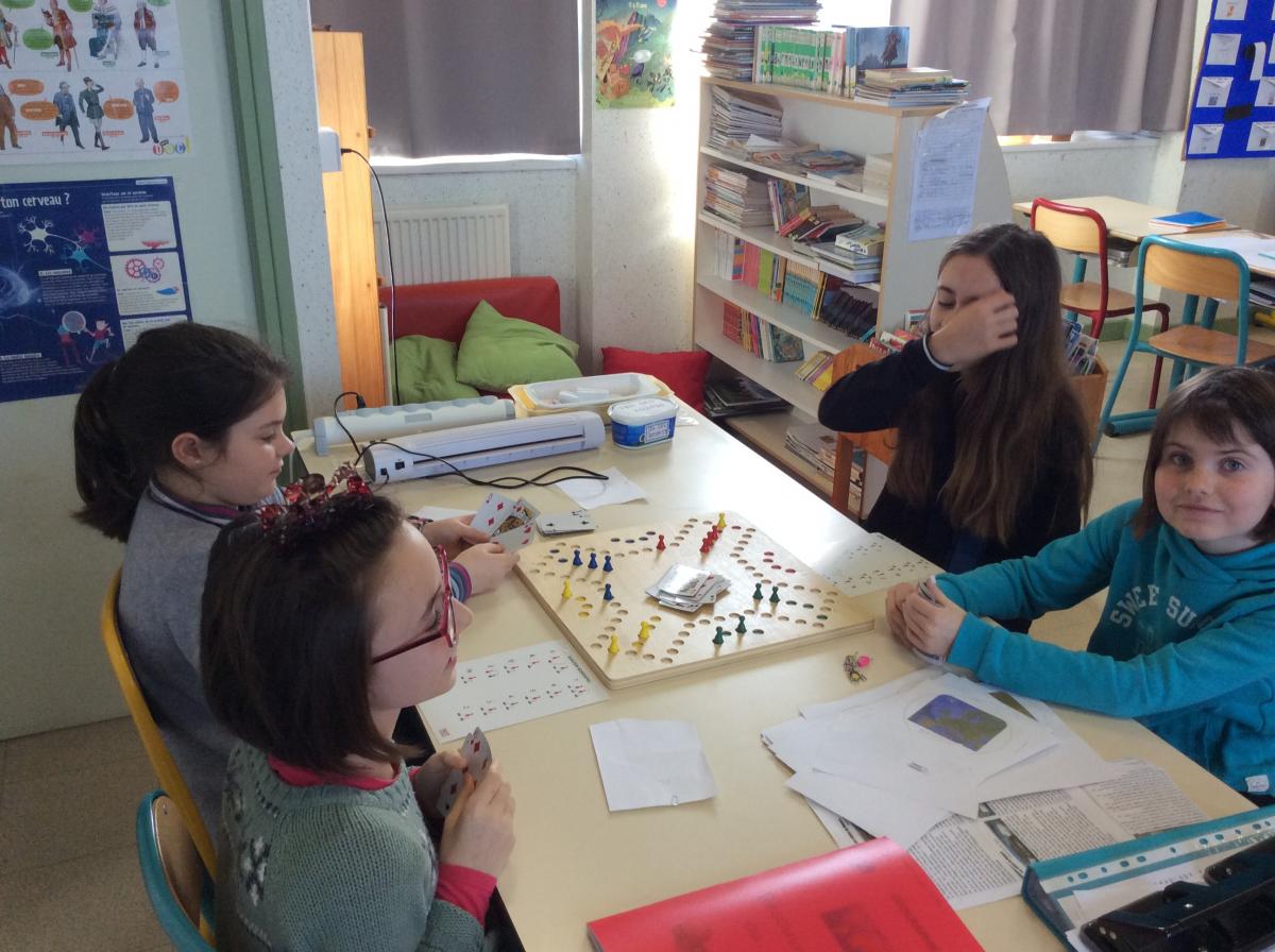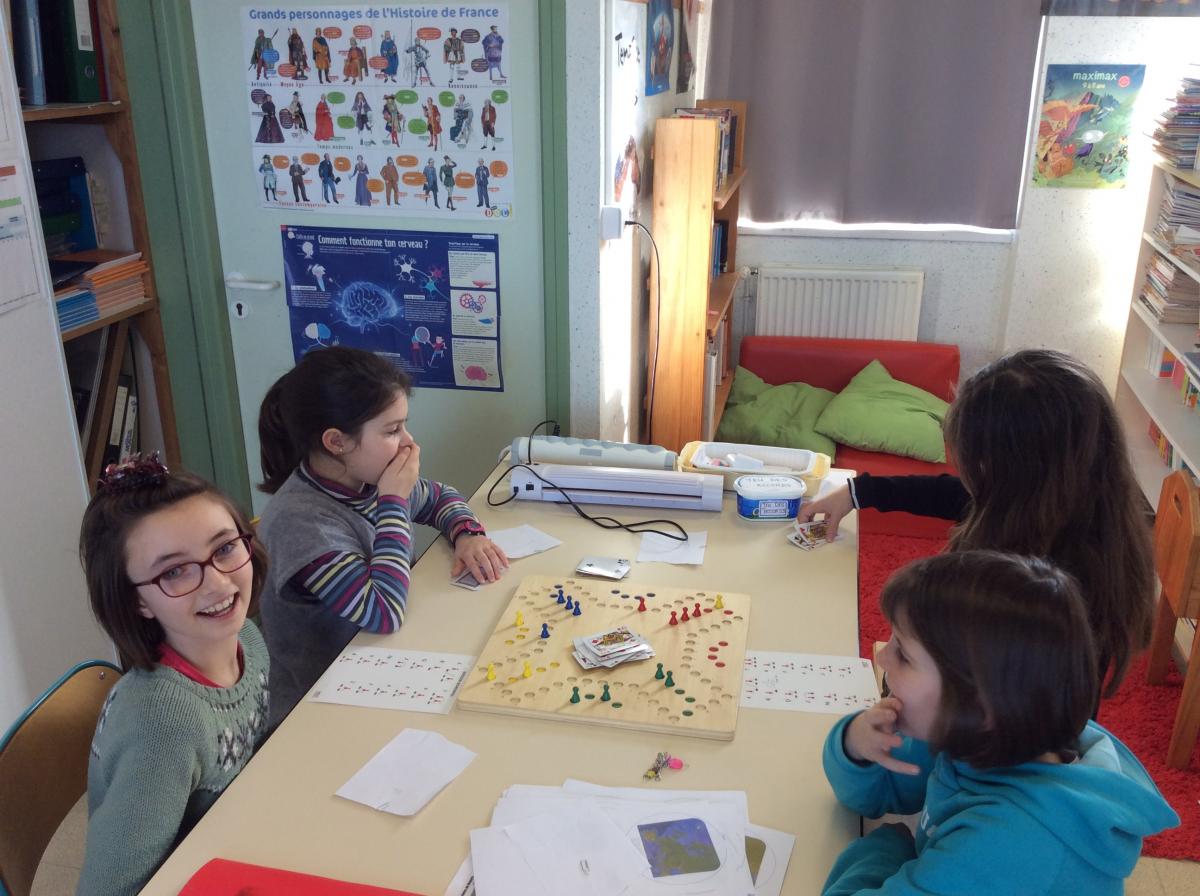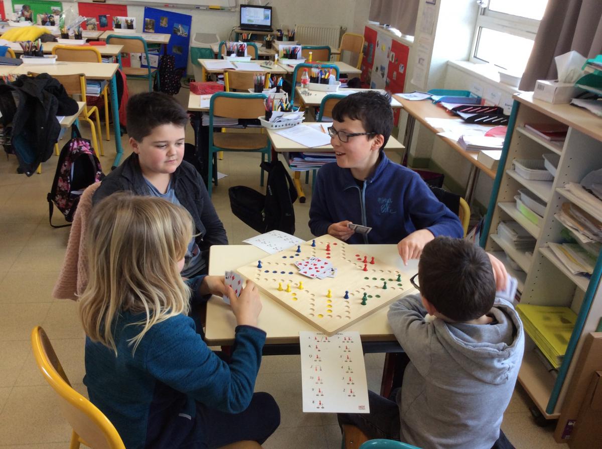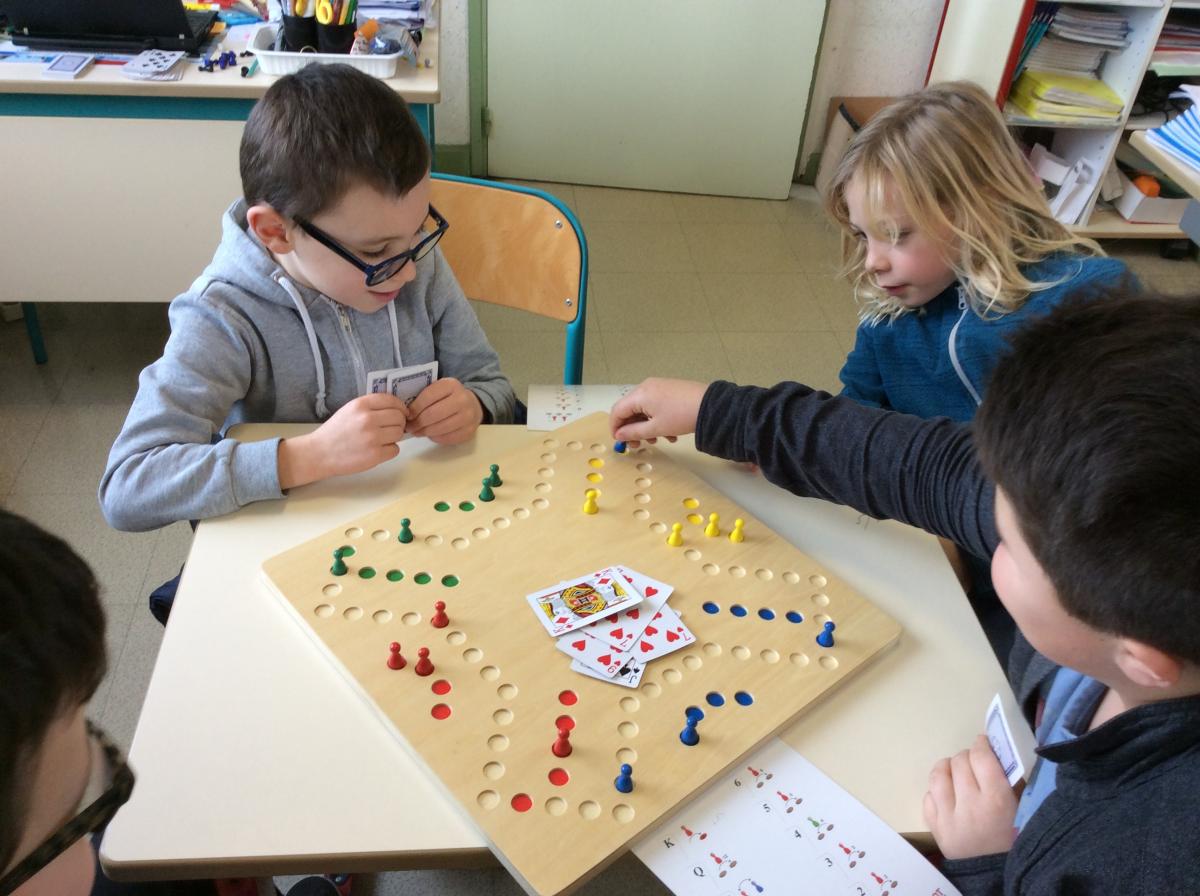 Depuis quelques semaines maintenant, le mardi midi, quelques élèves ont découvert un jeu qui mêle coopération et stratégie : le jeu de tock, appelé aussi petits chevaux canadiens. En effet, les enfants sont par équipe de deux et doivent rentrer leurs 4 pions dans leur "maison", après avoir fait le tour d'un plateau en s'y déplaçant à l'aide de cartes à jouer. Ils ont très vite compris les astuces du jeu et c'est souvent dans les rires que se termine la séance de jeu. Nous espérons maintenant assez vite pouvoir finir la partie commencée il y a deux semaines !+ Afficher / masquer la suite de cette publication ...